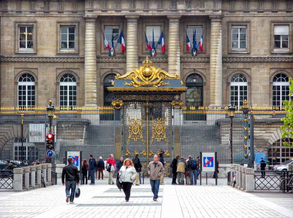 Continue along the Rue de Lutèce with the imposing Prefecture de Police to one side and facing you are the impressive gates of the Palais de Justice, HQ of the French judicial system and often seen on the TV drama ‘Spiral’.
