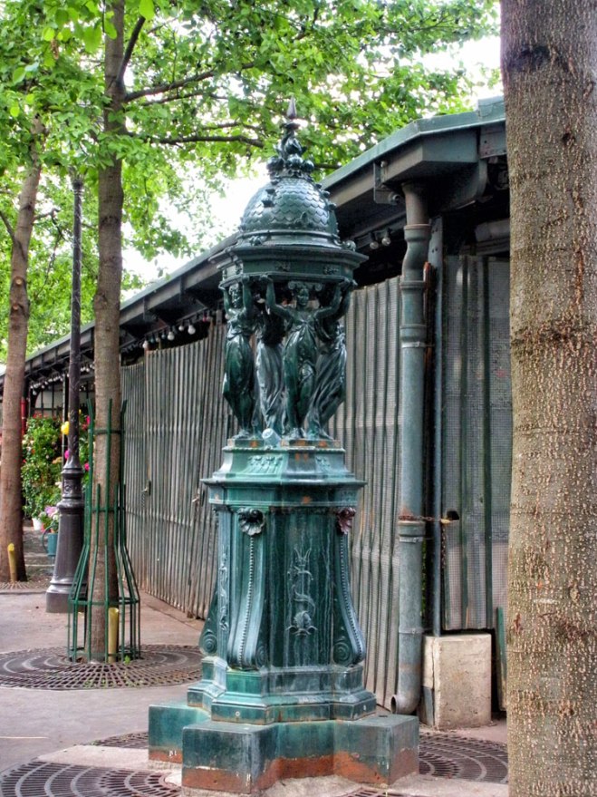 “Les fontaines Wallace” were named after the British philanthropist and art collector Sir Richard Wallace who generously financed the installation of 50 fountains throughout Paris after the Franco-Prussian War left the city with almost no clean drinking water. Designed by Charles Auguste Lebourg these cast iron fountains in four versions remain iconic darlings of the Paris streetscape. They are uniformly painted a deep emerald green to blend in with the tree-lined streets and parks and still provide free clean drinking water (eau potable) to all from March to November.