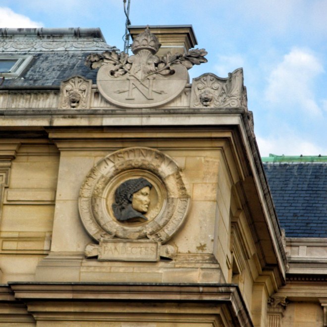 and if you turn into this street you will face the back of the Palais de Justice and again look up you can see a medallion in honour of the Pandects of Justinian (a compendium of Roman laws) on the wall