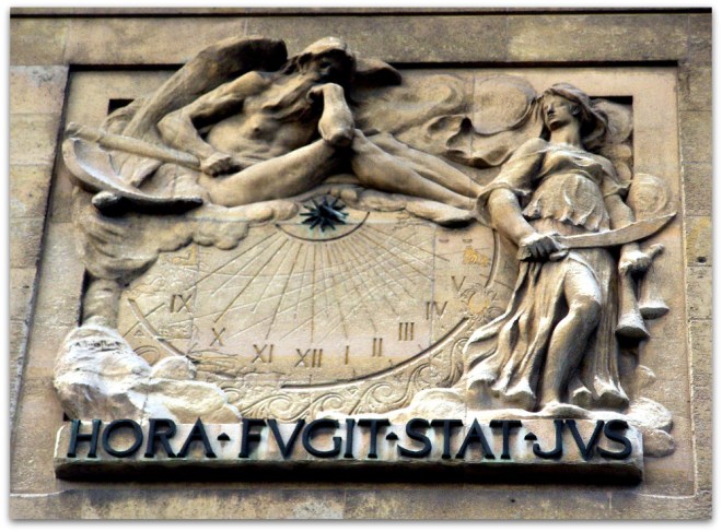 Rounding the corner and onto the Quai des Orfèvres, look up and you will find a superb sundial on the wall above you. Hora Fujit Stat Jus – meaning “The hour flies; justice remains” with a bas-relief of Time with his scythe and Justice with her sword and scales. As they say in French “lever le nez” – look up!