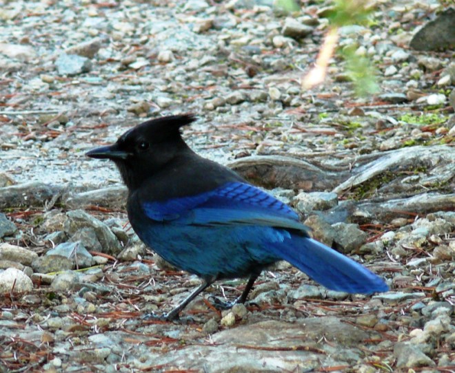 The Steller’s Jay is a jay native to western North America, closely related to the Blue Jay found in the rest of the continent, but with a black head and upper body. It is also known as the Long-crested Jay, Mountain Jay, and Pine Jay