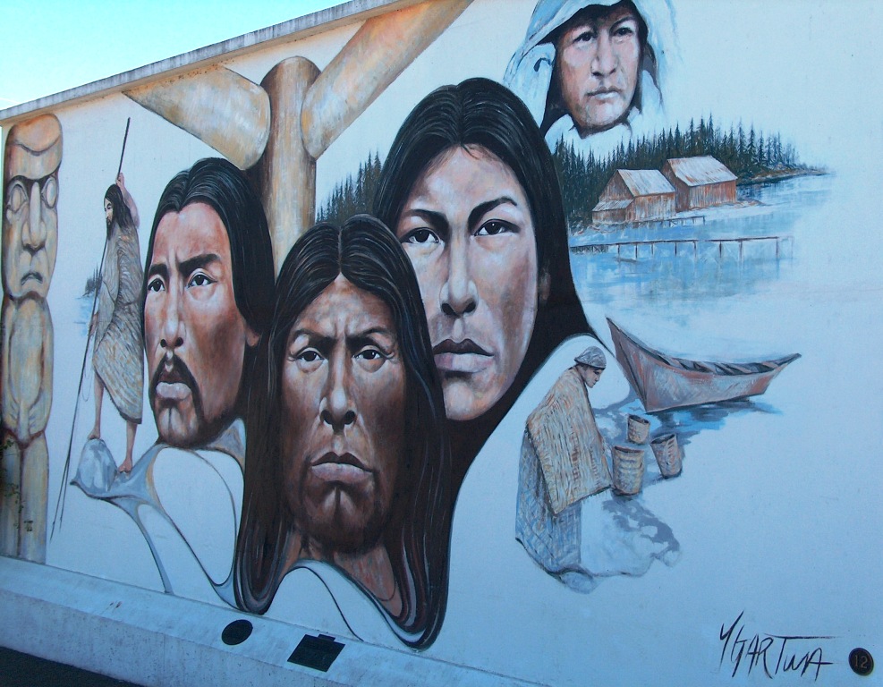 This immense mural is based on figures from the Native past and present in this area. Carved poles flank the central images of (left) Ce-who-latza, who was chief of the Lyakun Village on Shingle Point, Valdez Island, as well as a constable of the Native Police and a Native pilot for the Royal Navy; (centre) former Chemainus Band Chief Clay-sa-luke; and (right), a Salish woman. Among the other figures who appear is Mrs. Mary Rice, top right.