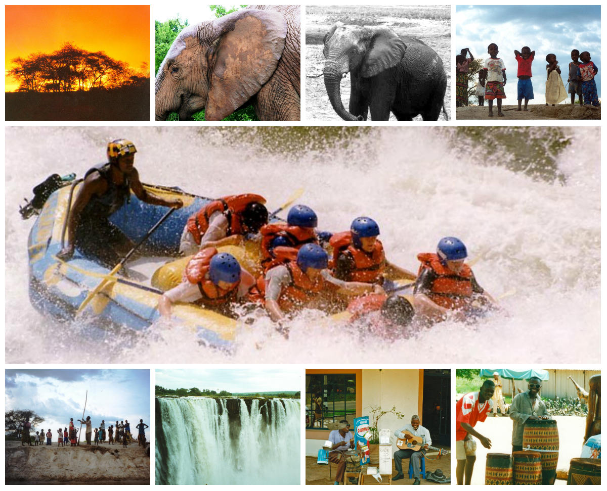 Botom: Zambian Villagers; Victoria Falls; Street Band and Hawkers in Victoria Falls
