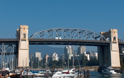 The Burrard Bridge (sometimes referred to as the Burrard Street Bridge) is a five-lane, Art Deco style, steel truss bridge constructed in 1930-1932 in Vancouver, British Columbia, Canada. The high, five part bridge on four piers spans False Creek, connecting downtown Vancouver with Kitsilano.
