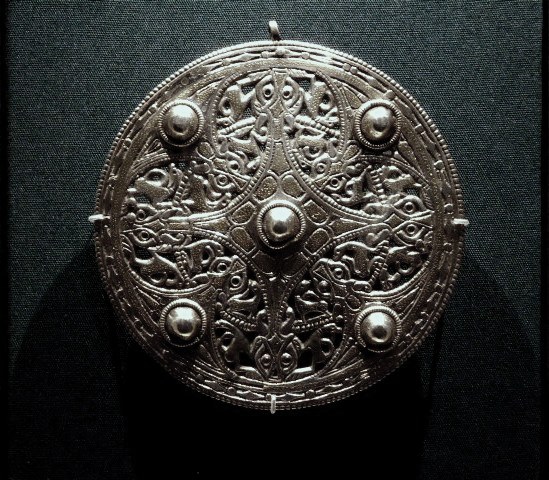 This large Anglo-Saxon silver brooch is of extraordinary craftsmanship and perhaps belonged to a high ranking churchman. The centre part is decorated with five figures representing each of the human senses. Β Sight is in the centre with large bulging eyes and he is surrounded by Touch, Taste, Smell and Hearing, who can be identified by their actions.