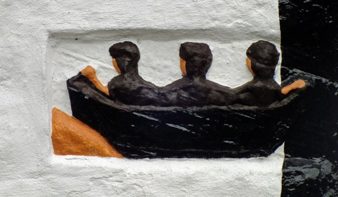 Isn’t it? I thought at first it was three nuns in a boat, and I have a vague idea that the lady in the corn mill said something about a stone coming from the abbey and mentioning this house, but I cannot find anything about it. Of course we forget that those medieval abbeys and churches were very colourfully decorated so I suppose it could have been there originally. But why? If I was a fiction writer then I could make up a story about it.