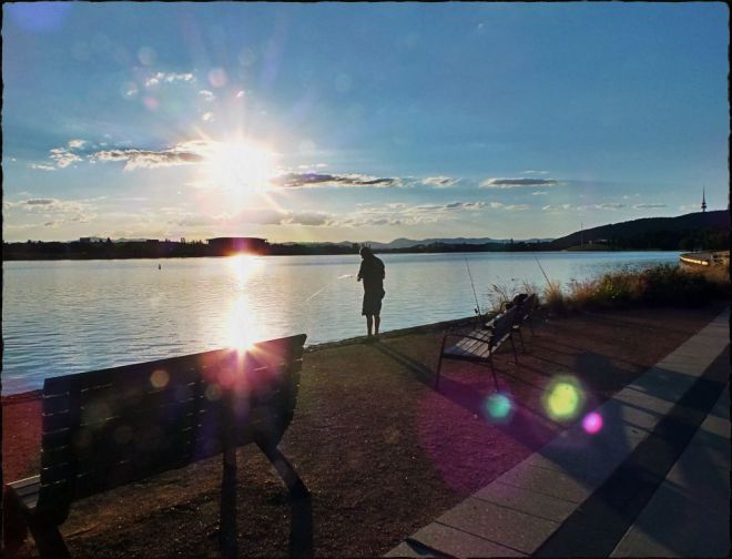Sun flares around Man Fishing