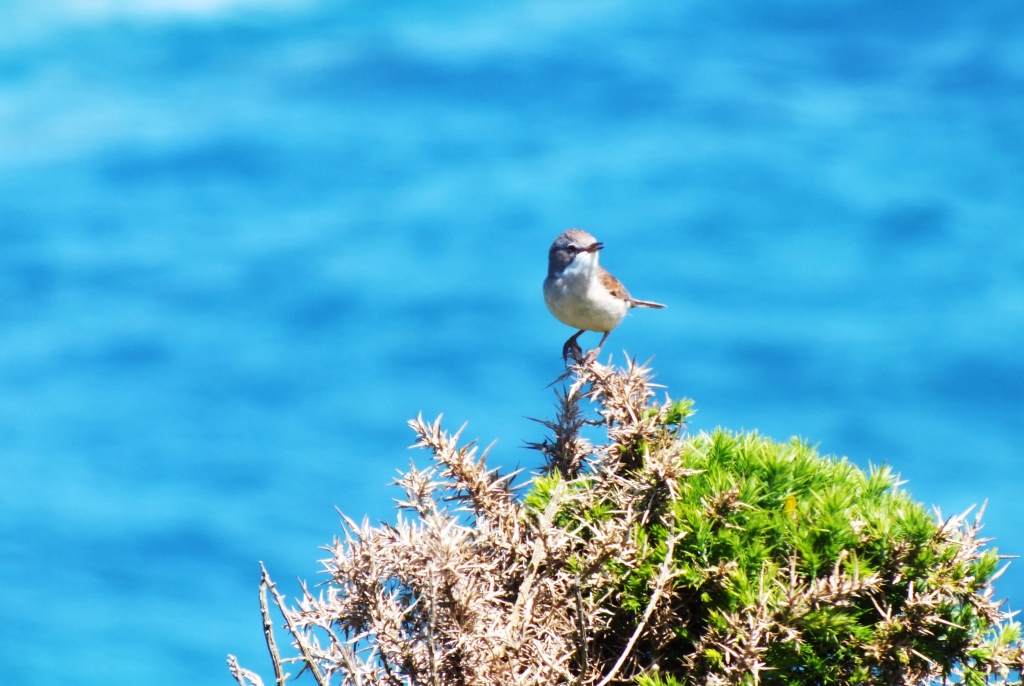 The whitethroat is a medium-sized warbler, about the size of a great tit. It has quite a long tail which it flicks and cocks as it darts rapidly in and out of cover. The male has a grey head, a white throat and a brown back, and is buff underneath.