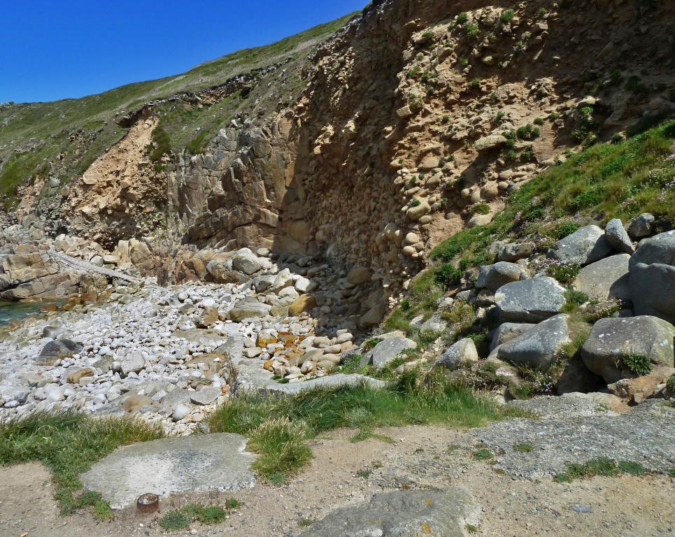 Porth Nanven is unusual in that the cliffs are formed from rounded boulders of an ancient raised beach, formed in the last ice-age. It is illegal to remove any stone from this location, though many might crave a few for their rockery.