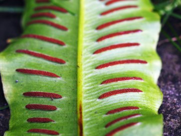 Previous ImageNext Image Spores on harts tongue / Asplenium scolopendrium Spores borne in conspicuous transverse stripes beneath the fronds