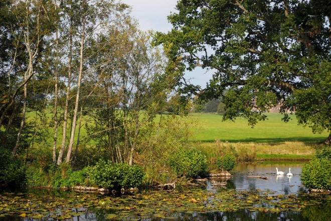 The pair of swans suddenly rise above the water and with a whooping sound they stretch out their long necks and flap their wide wings and glide elegantly to another section of the lake.
