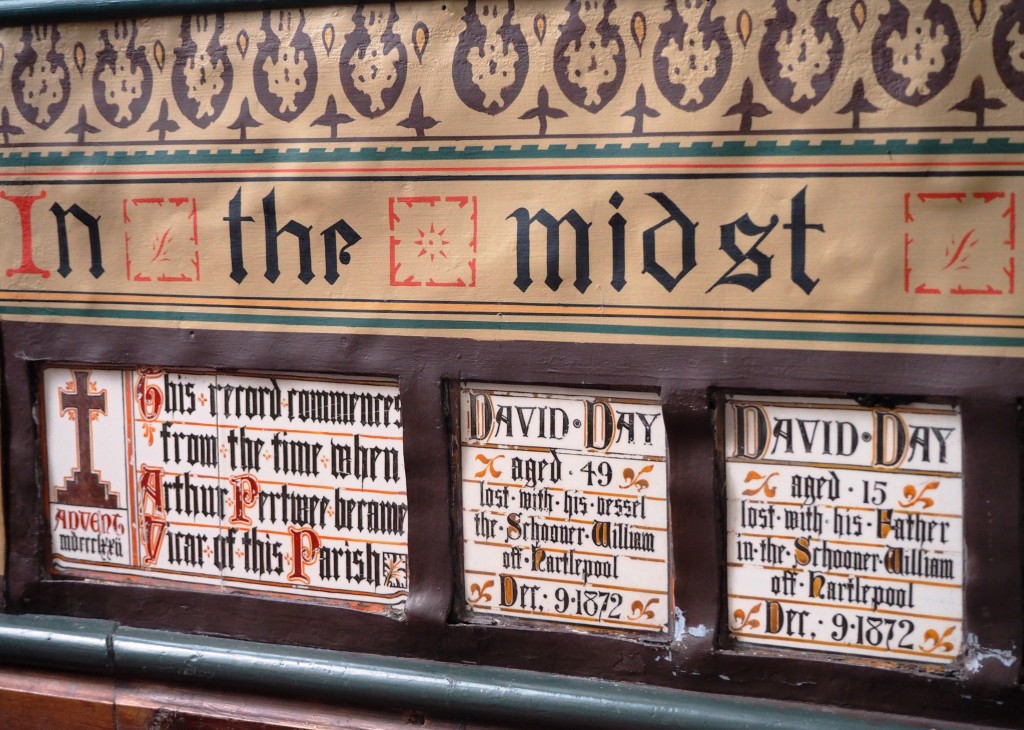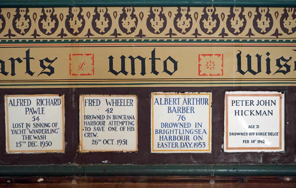 The Church contains some Roman brickwork and a frieze of memorial ceramic wall tiles commemorating local residents whose lives were lost at sea. In 1872 severe storms along the North Sea coast caused widespread destruction and terrible loss of life. Thirty six local seamen were lost from Brightlingsea, and this disaster prompted the then vicar Rev. Arthur Pertwee, to create a frieze of individual tiles, each inscribed with the name of the deceased and the ship on which he served. Since 1872 a tile has been added every time a Brightlingsea native is lost at sea. At first the tiles were limited to mariners by occupation, but this was altered to include anyone from Brightlingsea who lost their lives at sea. There is even a tile commemorating Sidney Siebert, who was not a fisherman, but was drowned in the wreck of the Titanic in 1912.