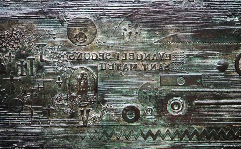 The sculptor wanted all the façade work to be captured in the centre door (2000). For this reason, he decided to reproduce the text of the Gospel illustrated by means of the sculptures, with over 8,000 smelted bronze letters erected ‘like two enormous open books’. The letters have a bronze patina and the repeated letter is one of the most emblematic techniques he used in order to turn message into a work of art.