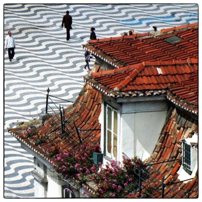A scene I am sure Becky will have seen for herself – this photo was taken from the viewing platform at the top of the Santa Justa Lift (Portuguese: Elevador de Santa Justa) in Lisbon. With a view over that amazing wave pattern in Rossio Square. Cropped and zoomed in to show the magnificent terracotta tiles.