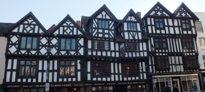 Heading back towards Castle Square and the market is King Street, a narrow lane with a double row of buildings facing back to back – one facing King Street, the other south on to Pepper Lane. This is the original Southern limit of the market area. Again there are some interesting timber framed buildings along here, some with deep jetties supporting the upper floors. Ye Olde Bullring Tavern has its roots in the 14th century though the current building dates from the 17th century. Take care not to walk into the road here as the pavement can be quite crowded and traffic can be busy. There have been plenty of times where I have had to brake hard to avoid a pedestrian.