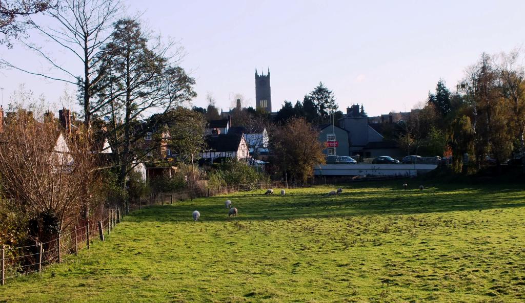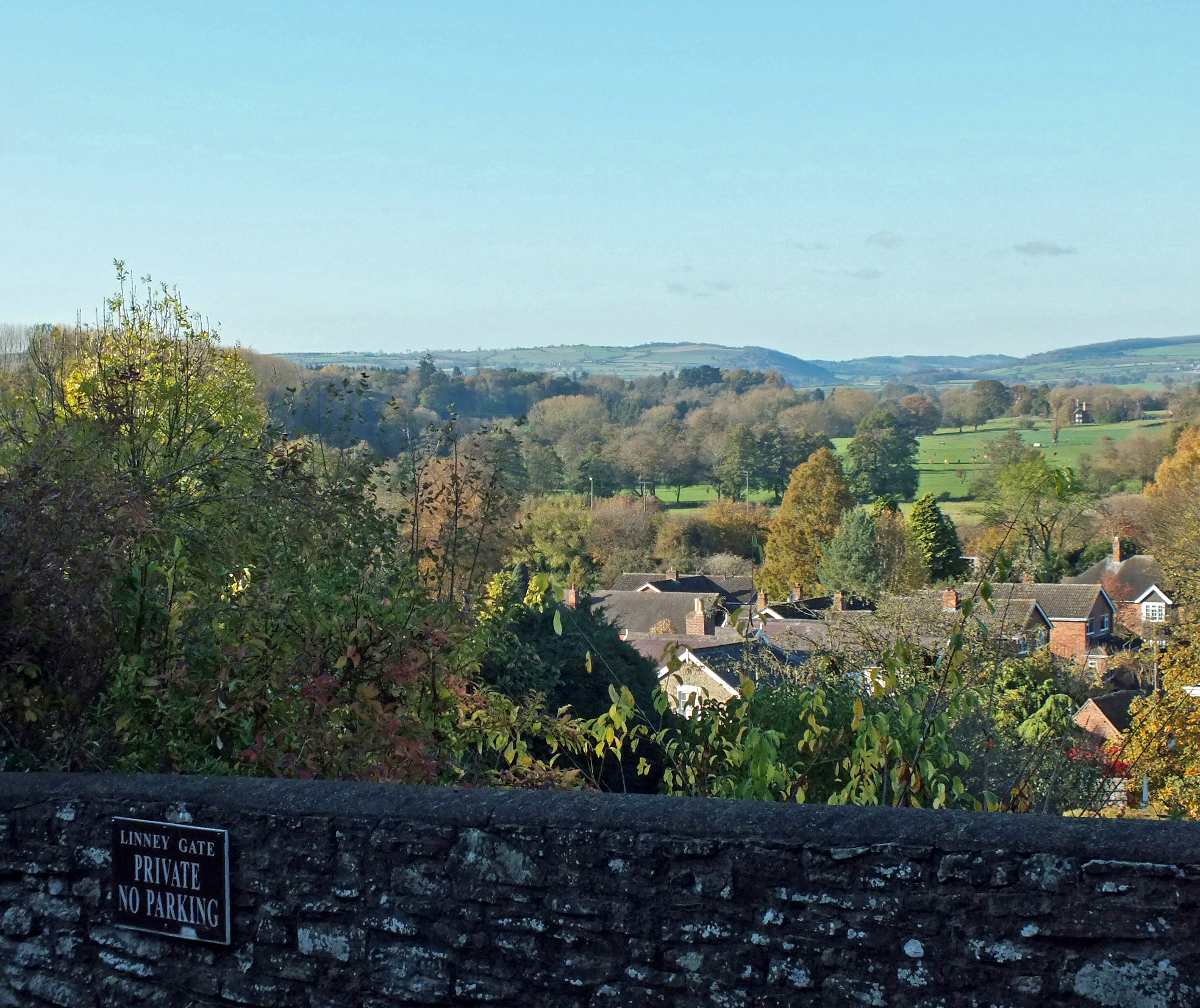 We’ll stop briefly and have a look at the views towards the South Shropshire Hills from the church green before continuing through the town walls and the site of one of seven original gates – Linney Gate – which overlooks the Linney – a damp riverside area probably used for the growing of flax in early medieval times.