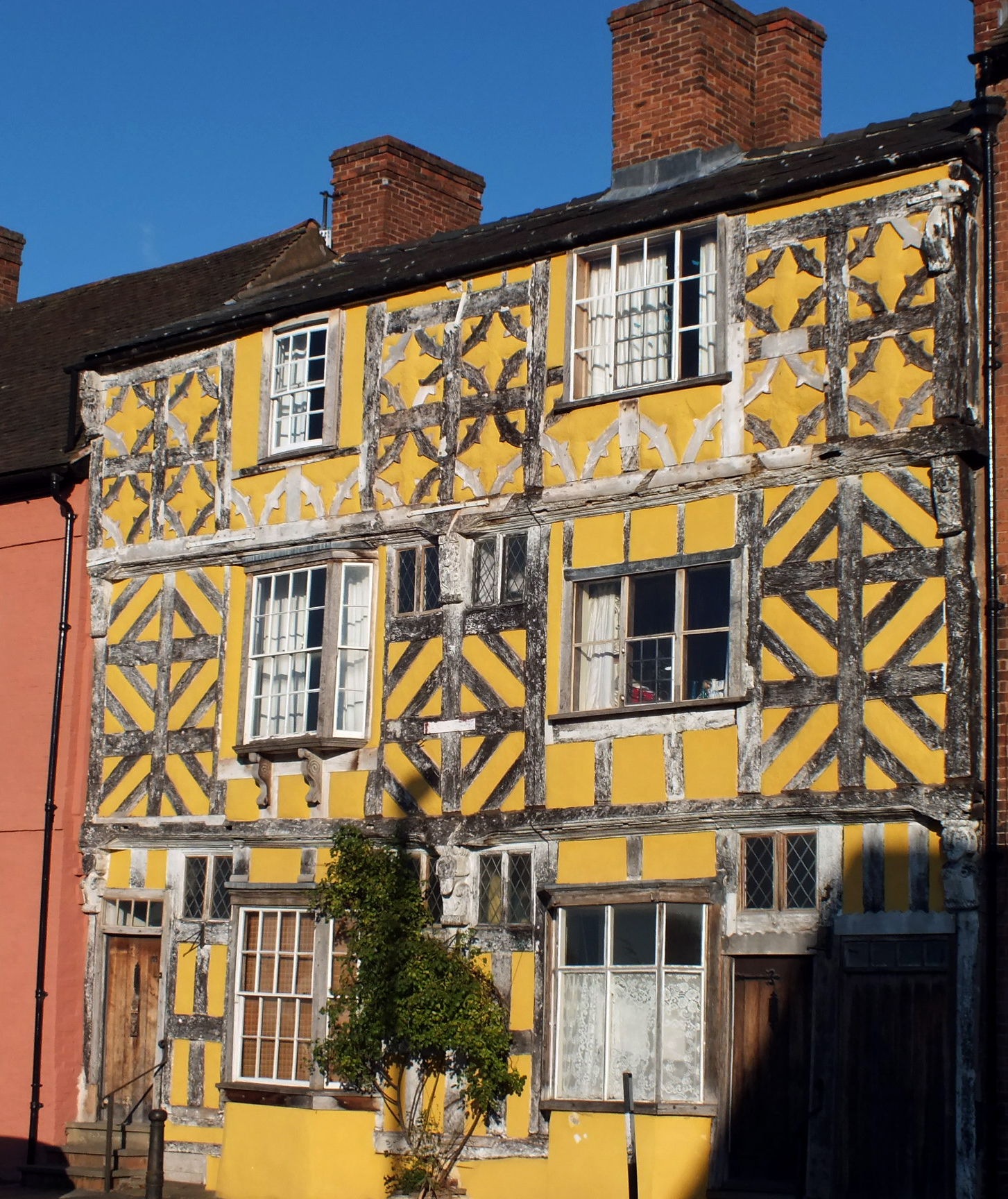 Glove making was another major industry in Ludlow during the early part of the 19th century and opposite the Unicorn you will see the lilac coloured Glover House which has light airy rooms, high ceilings and unusually large windows providing more light for the glove workers. Now it is a fine town house. At the end of Lower Corve Street you pass an impressive yellow painted timber framed house.