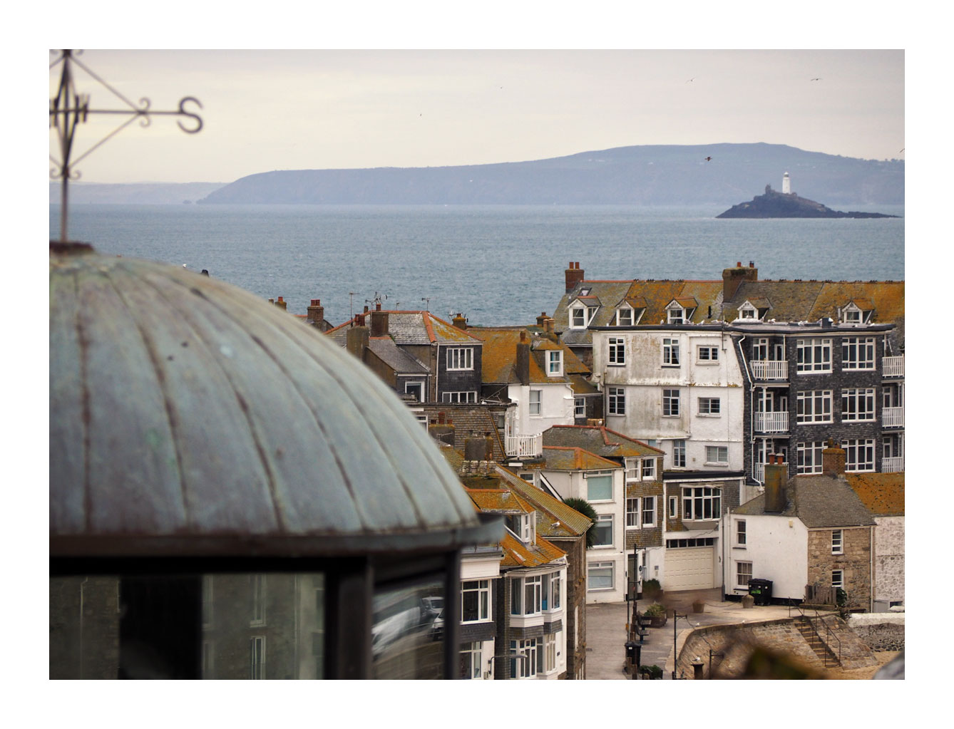 My subject this month is the Godrevy lighthouse. Photographed many times and from many different angles and locations. I’ll begin with a photo taken from the town of St Ives itself which overlooks St Ives Bay and towards the north Cornish coastline. On a winter’s day the colours are rather muted shades of ochres and grey and white instead of the usual vibrant colours. The lighthouse quietly lurks in the background, roughly using the rule of thirds by positioning it in the top third of the frame, whilst in the foreground is a blurred observatory tower which I thought neatly balanced the image, the rounded cupola echoing the rounded shape of the rock on which the lighthouse stands.