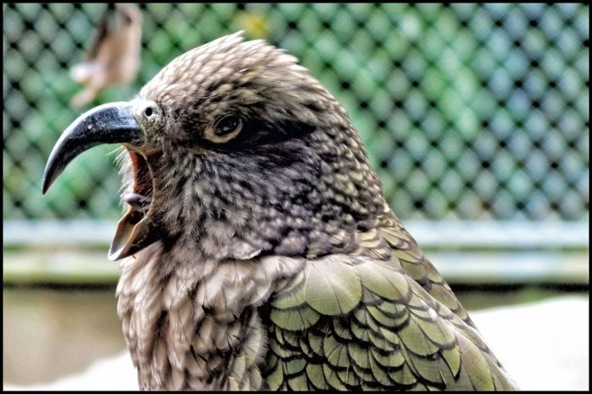 Finally this shot of a Kea (New Zealand parrot) with the pattern of the diamond-shaped fence in the background. Now this one breaks the rule of having the subject too large in the foreground, but does it distract from the pattern? Or does the pattern form a geometric balance to the curves of the bird’s feathers? I like the fact that the background is of similar hues to the subject.