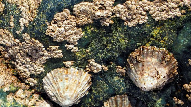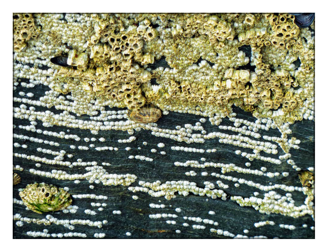 I have deliberately not gone in too close for the photograph above as I wanted to show the context of these organisms as they coexist on the seashore as well as the almost smooth surface of the rock to which they are attached. In contrast the image below focuses on the rough textures.