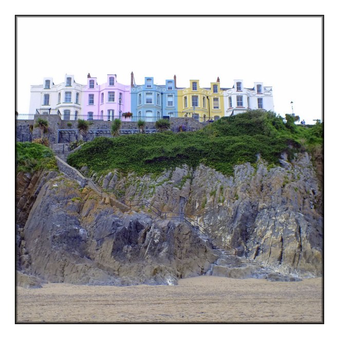 This wonderful row of candy-coloured four storey Victorian townhouses (mainly holiday apartments, B&Bs or hotels) is situated at the beginning of the Esplanade above the rocky cliff and stairs that lead down to South Beach in Tenby, South Wales. What a commanding view they have of the monastic Island of Caldey and St Catherine’s Castle.