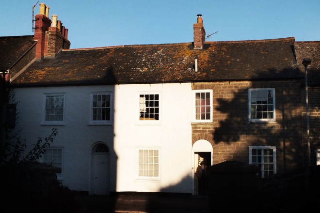 (1) Evening shadows on a row of terraced houses in Bridport, Dorset. I particularly like the elderly gentleman emerging from his house at that moment, into the shadows.