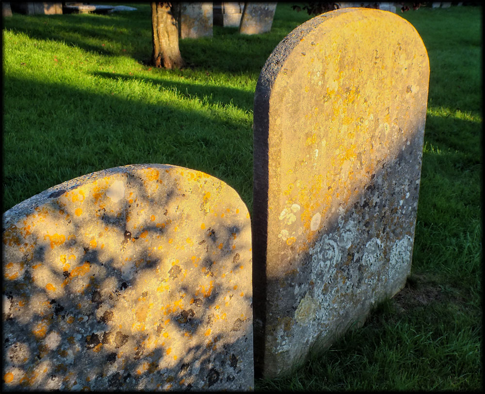 (7) And finally old worn headstones in a churchyard among dappled sunlight and deep shadows. Again captured as the sun begins to set.