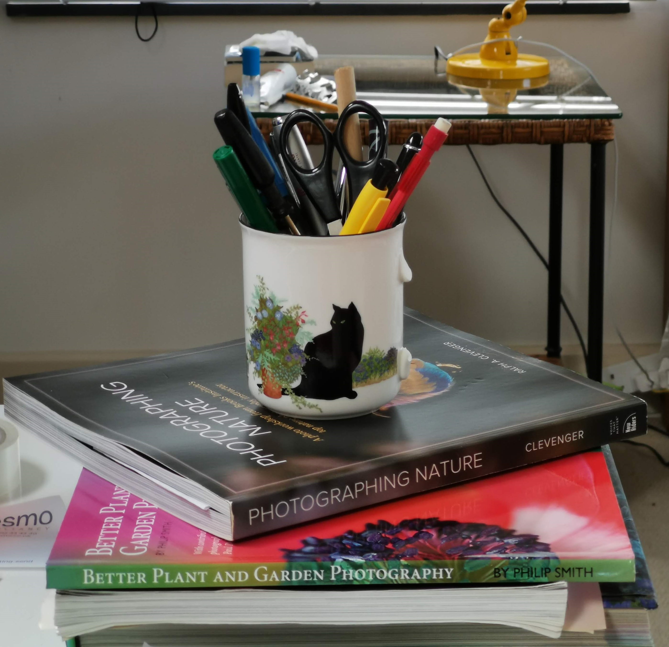 (3) F/16 – a deep depth of field (high) where not only is the mug of pens in focus but you can now make out the table and the base of the lamp in the background. Everything is in focus.