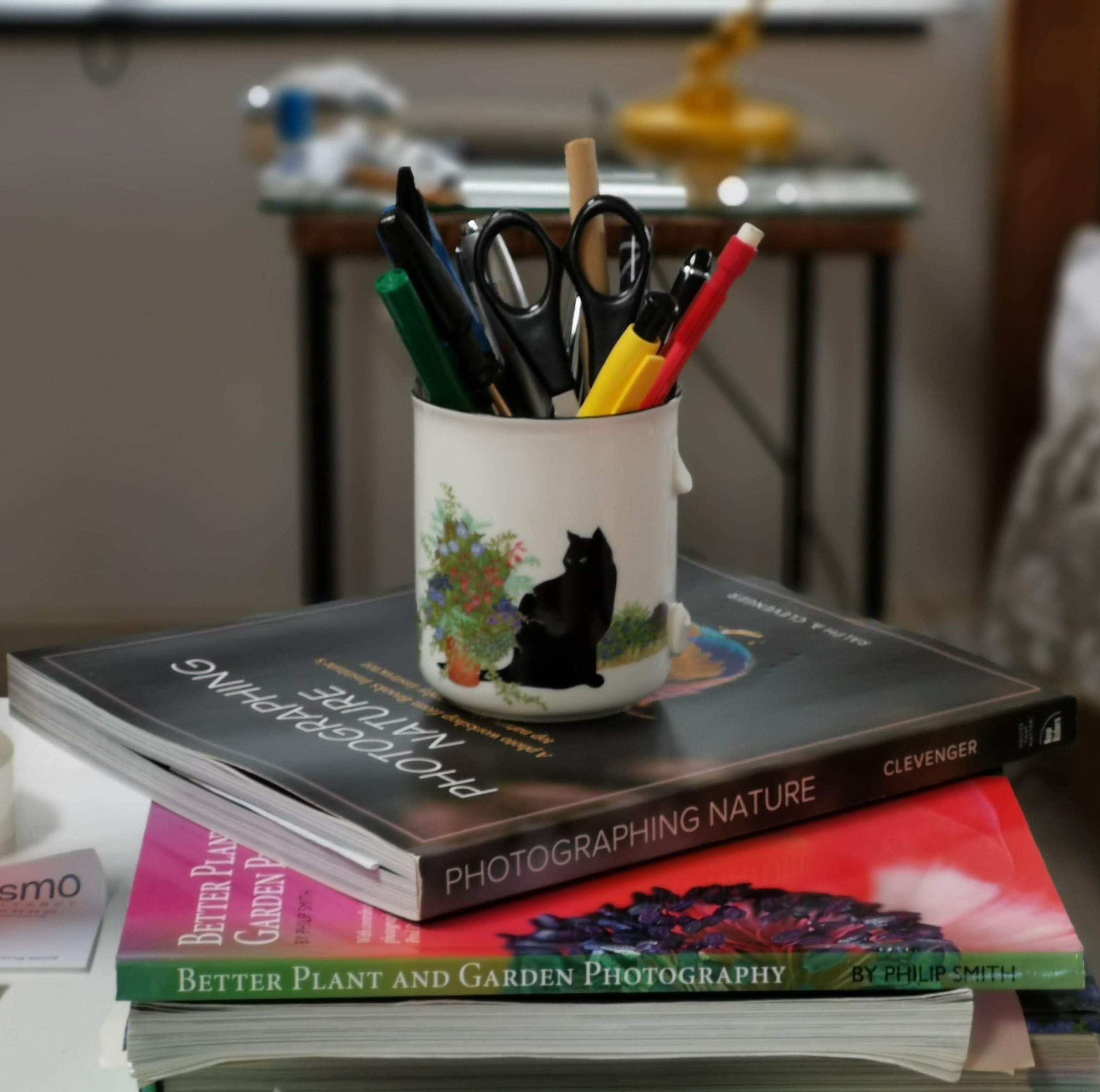 (2) F/ 4.5 – an intermediate depth of field (medium) where the focus remains on the mug of pens, but the background is more in focus and you can start to make out shapes.