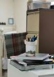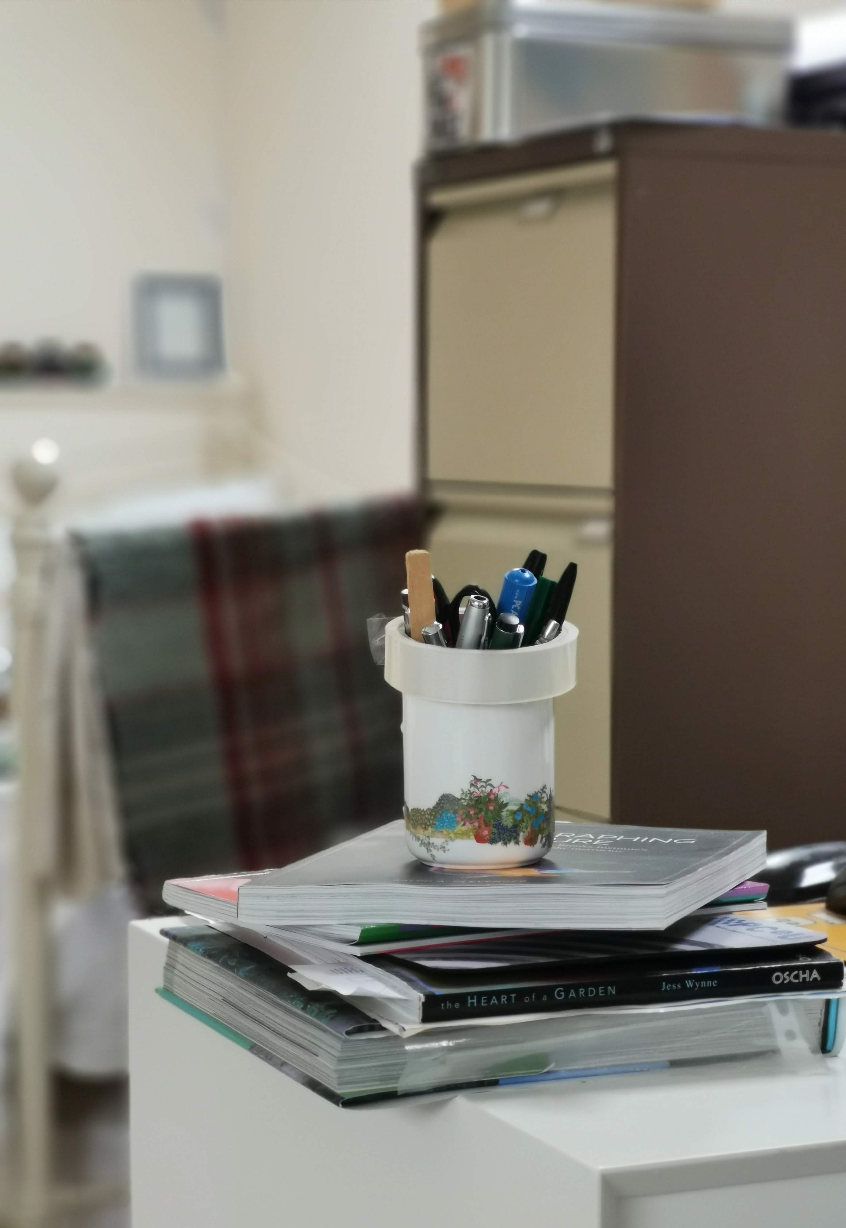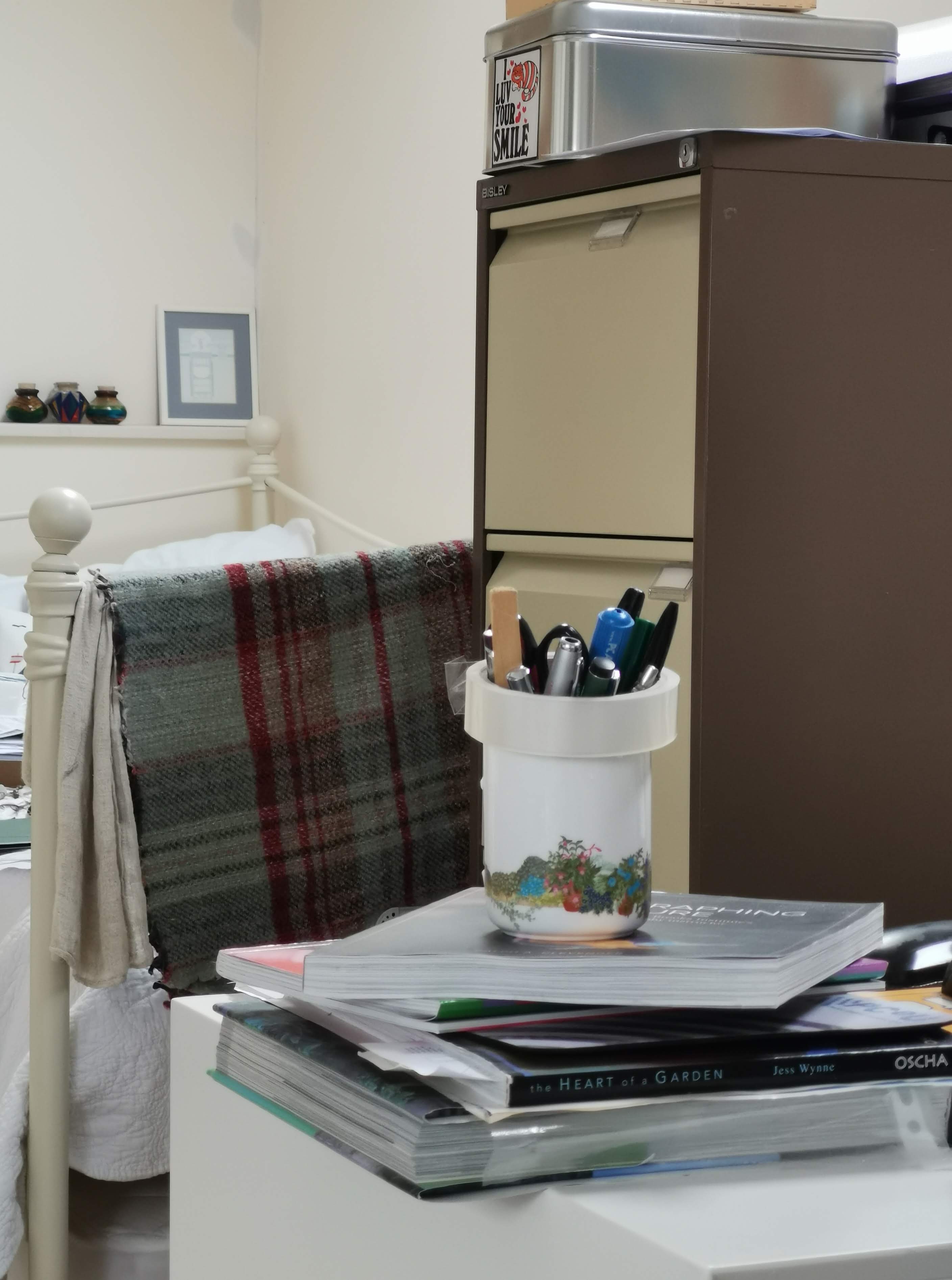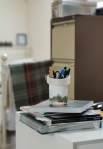 (3) F/16 – a deep depth of field (high) where not only is the mug of pens in focus but you can now read the label on the tin on top of the filing cabinet and almost see the small picture in the background. Everything is much more in focus.