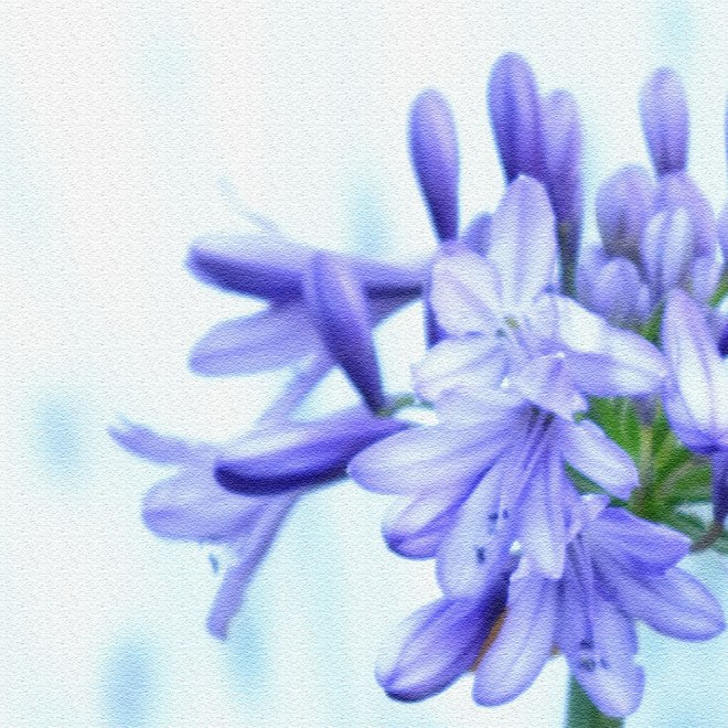 This image of an Agapanthus has been photographed against a background of other flowers with the sun behind me, giving a washed-out background. The photo has been digitally altered by using a soft textured filter which I think creates a painterly effect.