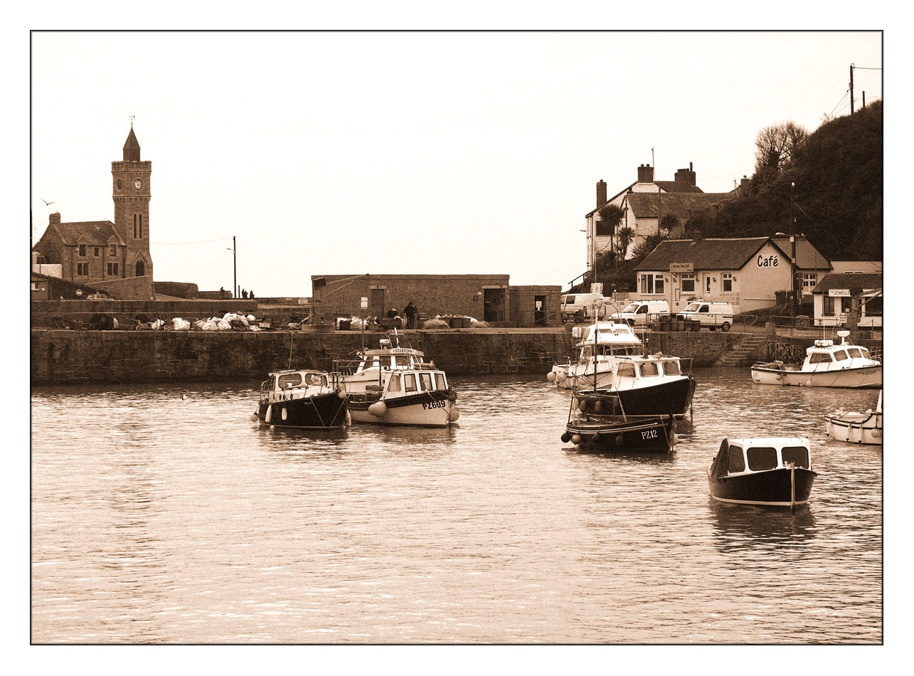 This image of the harbour in Porthleven was taken on a dull day so there are not many shadows, there are however a number of contrasting colours on the fishing boats. I have used a sepia effect in my post-processing software to produce this monochromatic tone,