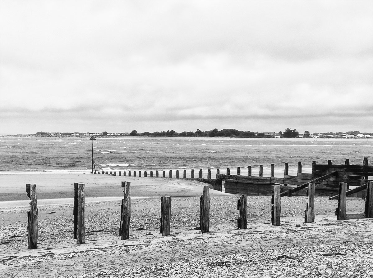 West Wittering beach in colour does not have any dramatic colour contrasts, rather a bleached look which I like and I took this shot because of the lines of the groynes. I think this works in black and white as the posts are still the focus of the shot.