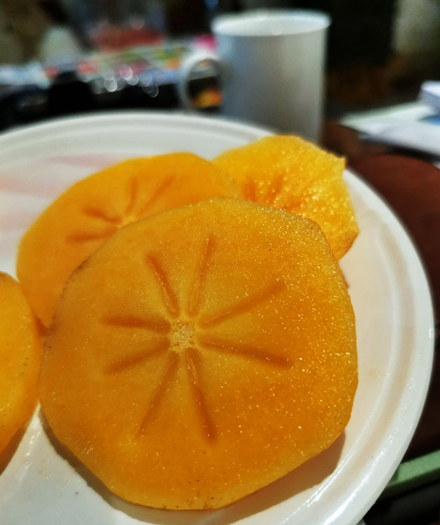 My first Persimmon fruit. Apparently there are two types: astringent, often called hachiya persimmon, and non-astringent, or fuyu. I’m not sure what this one is. I guess the firmer one (fuyu) so I peeled it and sliced it and ate it like an apple.
