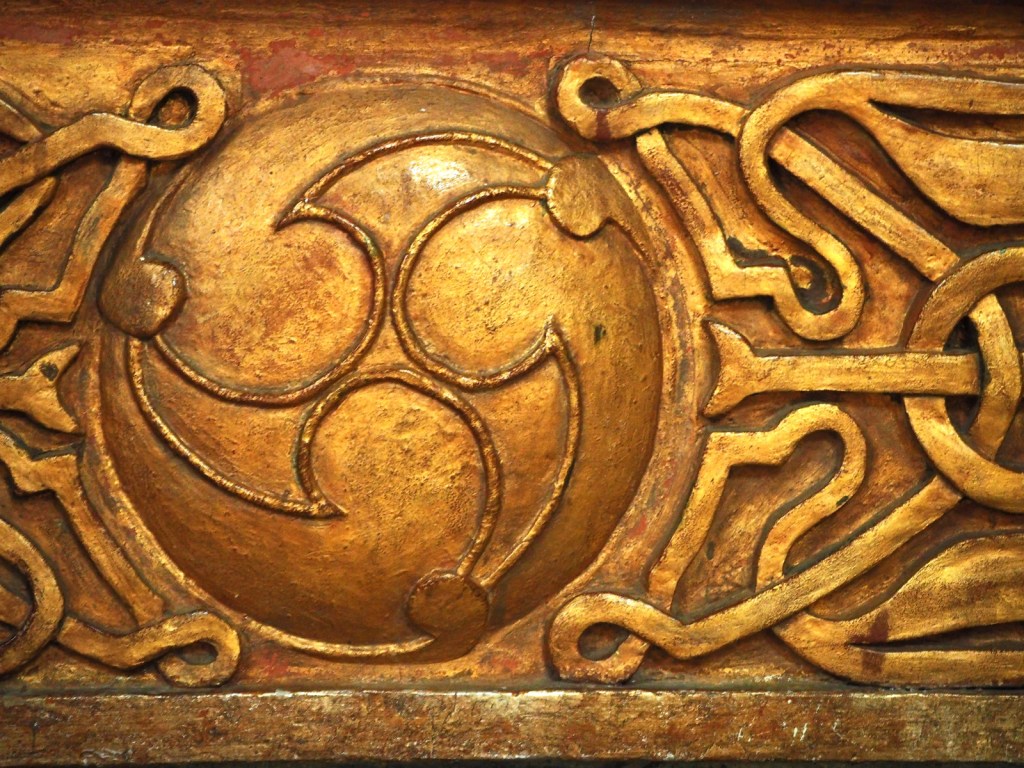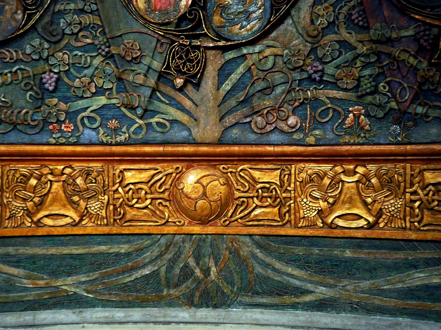 Watts Chapel near Guildford in Surrey – A golden terracotta girdle circles the interior with a series of flowers created by the village children. The altar gleaming in the gloom. More than 70 villagers worked alongside Mary Watts to create the tiles to help decorate the Chapel.