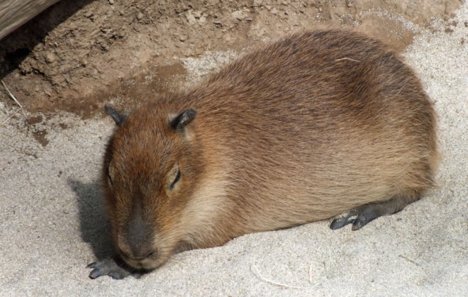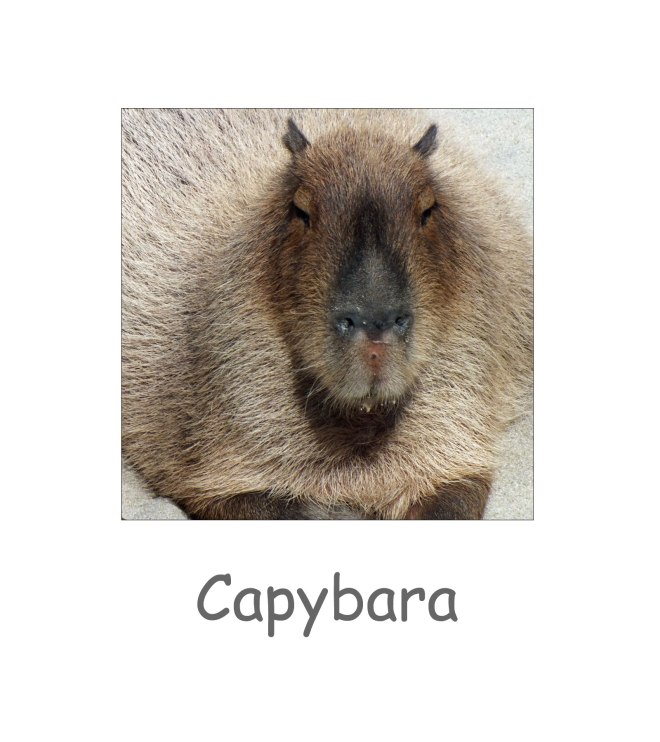 Originally thought to be a pig of some sort, we now know that the capybara is a rodent, closely related to cavies and guinea pigs. Standing 2 feet (60 cm) tall at the shoulder and built somewhat like a barrel with legs, the “capy” has long, light brown, shaggy hair, a face that looks like a beaver’s, no tail, and slightly webbed feet.