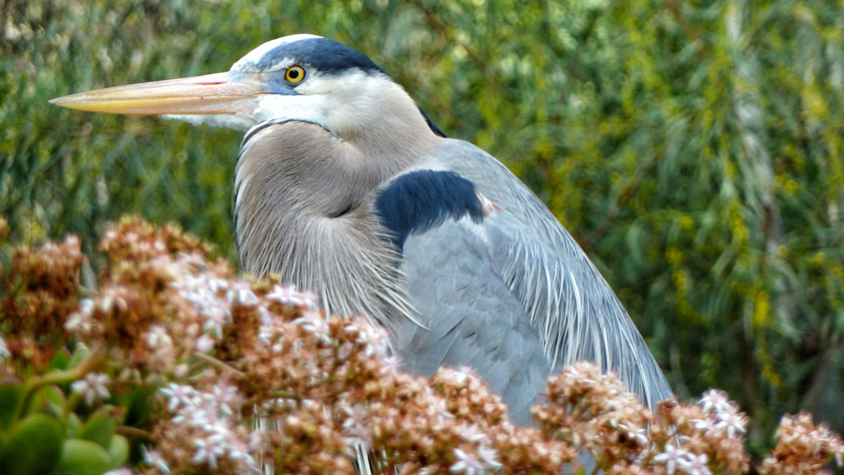 The Great Blue Heron is the largest of the North American herons with long legs, a sinuous neck, and thick, daggerlike bill. Within colonies territorial display includes ruffling the long breeding plumes. Highly adaptable, it thrives around all kinds of waters from subtropical mangrove swamps to desert rivers to the coastline of southern Alaska.