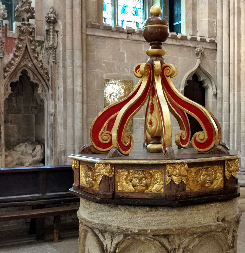 The ‘drum’ part of the font dates from late Anglo Saxon times and over a thousand years old. It was brought from the first cathedral, before this one was completed and still used today. The cover is much younger (c1635).