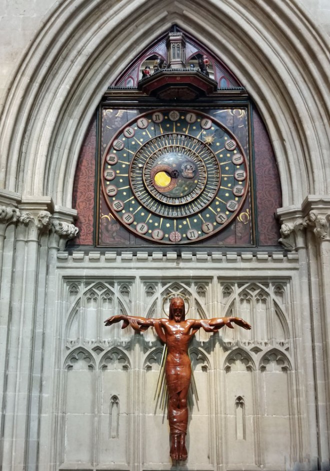 Previous ImageNext Image clock Clock and figure of Christ risen from the dead is carved in yew by E J Clack and placed here in 1956.
