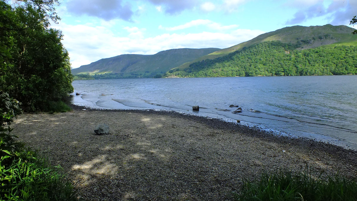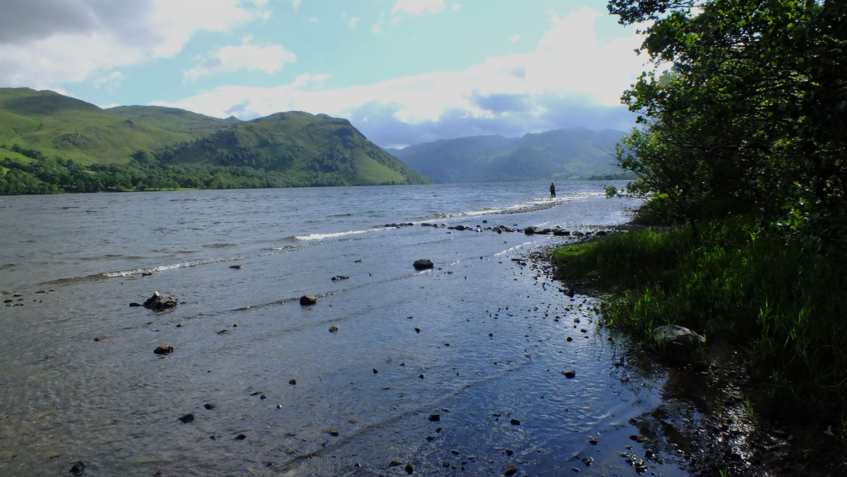 The lake is shaped like a crooked finger, with high fells surrounding the Glenridding end and rolling farmland to the north.