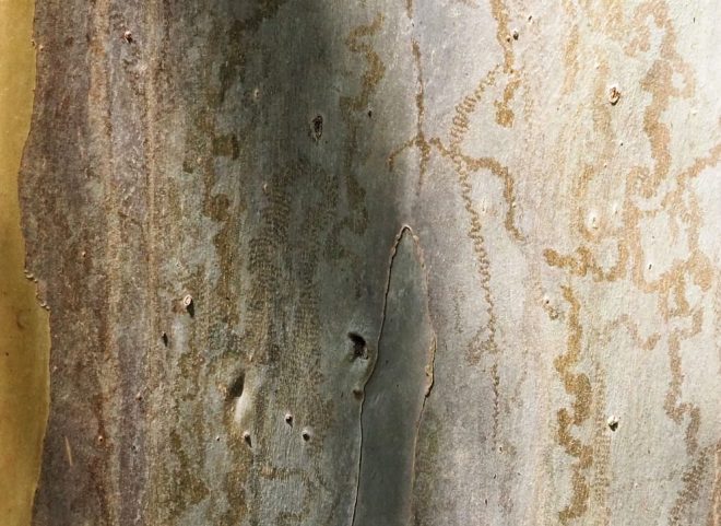 Scribbly gum is a name given to a variety of different Australian Eucalyptus trees which play host to the larvae of scribbly gum moths which leave distinctive scribbly burrowing patterns on the bark.