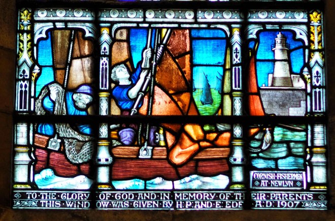 In the foreground is a fishing boat, with an older sailor sorting the fishing net while his younger companion raises the sail. In the distance is a fleet of fishing boats, and to the right is the Newlyn lighthouse and jetty.