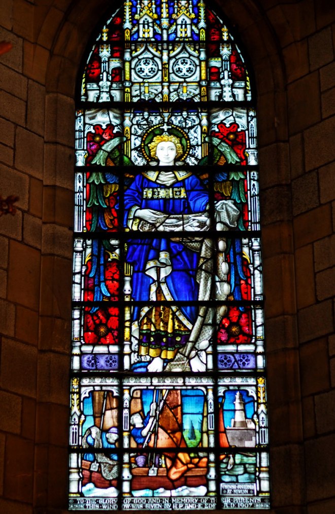 The guardian angel of fishermen dressed in flowing robes and depicted with long wings, bare feet, and a nimbus with a bejewelled rim. The angel holds a net full of fish with floats.