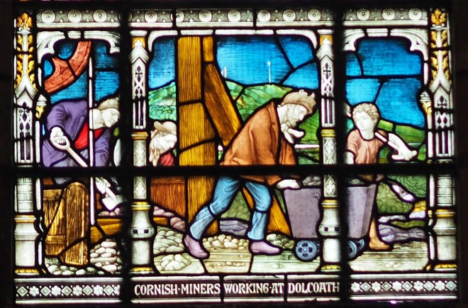 To the left and centre are the pit head with part of the pit wheel and men working. The hill in the background is Carn Brea; the cross on top of it is a monument to Francis Basset, 1st Baron de Dunstanville and Basset, and to the left are the remains of Carn Brea Castle. The Basset family were the original owners of the mineral rights to Dolcoath mine.