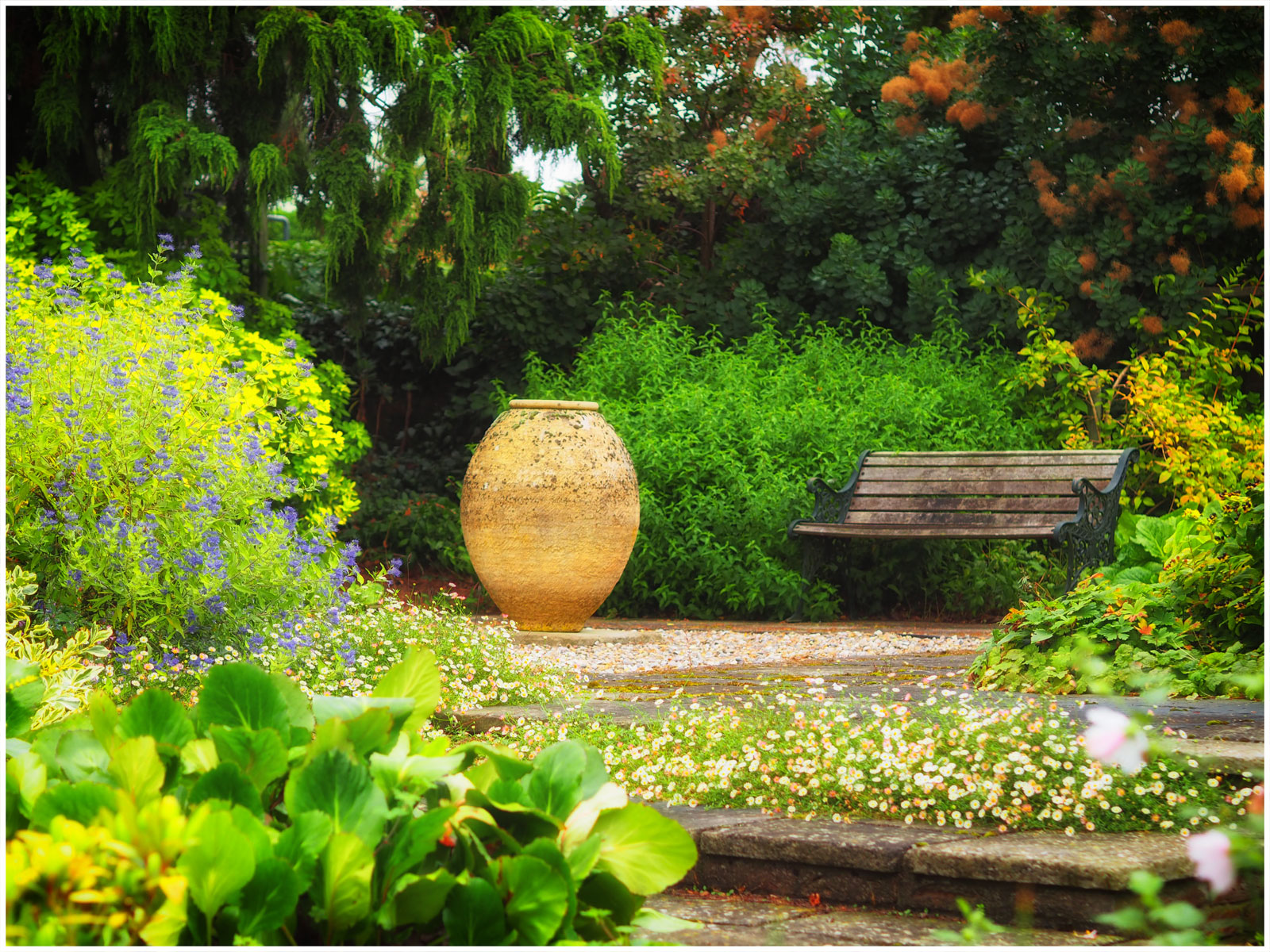 Bench in Beth Chatto’s garden 10 minutes’ drive from Colchester, Essex