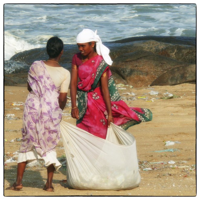 Wild storms had caused a great deal of rubbish to wash up on the shores of this resort just before we arrived; a great deal of it plastic. These ladies battled with the wind to collect the rubbish and remove it from the beach. The wild storms that we are experiencing today courtesy of Storm Bronagh reminded me of this photo.