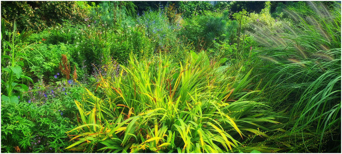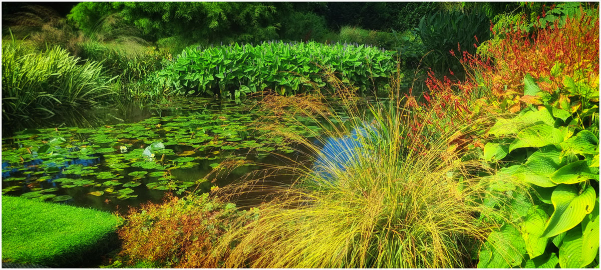 A short walk onto the cool, emerald-green grass of the Water Garden feels like stepping into another climate. In stark contrast to the hot, arid Gravel Garden, this area features lush, moisture-loving plants.