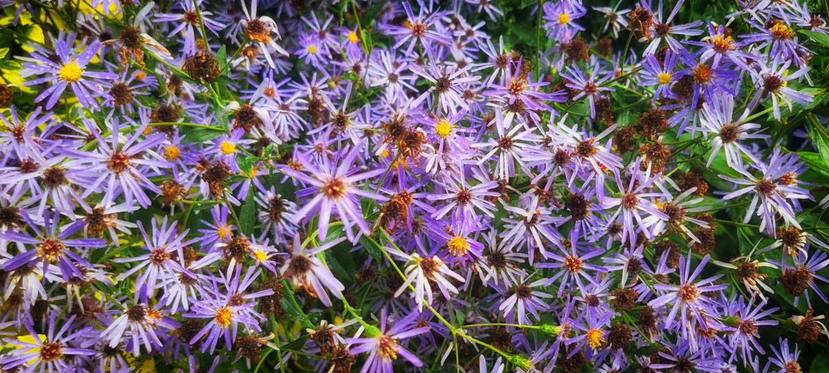 Ornamental grasses are used throughout this garden area too.Several types of asters, such as Aster tataricus, Eurybia radula, Aster pyrenaeus ‘Lutetia’, and Symphyotrichum ‘Prairie Purple’ and ‘Primrose Path’, are specifically mentioned as being grown or sold at Beth Chatto’s Gardens.More ornamental grasses and the purple heads of Eutrochium purpureum, also known as Sweet-Scented Joe-Pye Weed, features large, flat-domed heads of pink-purple flowers on sturdy stems, and is attractive to butterflies.
