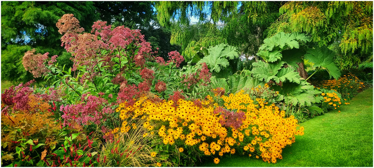 Asters and Pompon Dahlias in the Long BorderMiscanthus sinensis ‘Kleine-Silberspinne’The Herb, Potager and Cottage Garden with shelterBeautiful dahlias everywhereDogwoodOne moves between the new garden and the original garden, created by Lady Anne Palmer, through a tunnel beneath a road passing this little bridge and fabulous Japanese maple.Croquet lawn and Temperate HouseThe Stone Garden has a very Japanese feelCercis canadensis commonly known as Redbud trees or Judas treesHot colours in the form of RudbeckiasRosemoor House is fairly modest considering it belonged to the Earls of Orford who descended from Horace Walpole. It can now be rented out for holidays. There is a small tea-room at the side.More asters on the verandaThe Cherry Garden – best in springtimeA Kaleidoscope of colours (Dahlias – some with bees)The Lakeside in October is ablaze with autumn colour, from the molten leaves of liquidambars to the bright yellow foliage of Cornus sanguinea ‘Winter Beauty’ and the deep red of Acer palmatum ‘Chitose-yama’ – all reflected on the mirror-like water.
