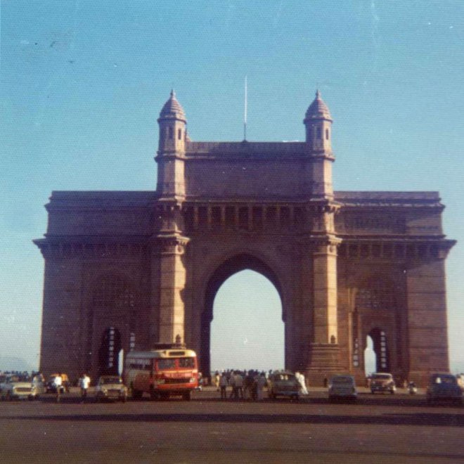 We are totally exhausted from the journey by the time we reach Bombay the following evening. Stepping out onto the platform was like hitting a wall – the air was so thick I could taste it on my tongue. Delhi had been dry and comfortably warm during the day though bitterly cold at night. Here the climate is typical tropical with monsoon rains and extreme heat and humidity. We find a cheap hotel (Carlton) near to the Gateway to India (below) and close to the Hotel Ritz, but certainly not of the same calibre. In the high-ceiling box room the blades of the ceiling fans spin lackadaisically, supposedly cooling us, the occupants, but not the air itself. I can’t say they kept me cool and the clack-clacking noise would have disturbed my sleep had I not been so bone-tired.